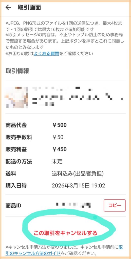 ①商品の取引画面の一番下にある「この取引をキャンセルする」をタップします。