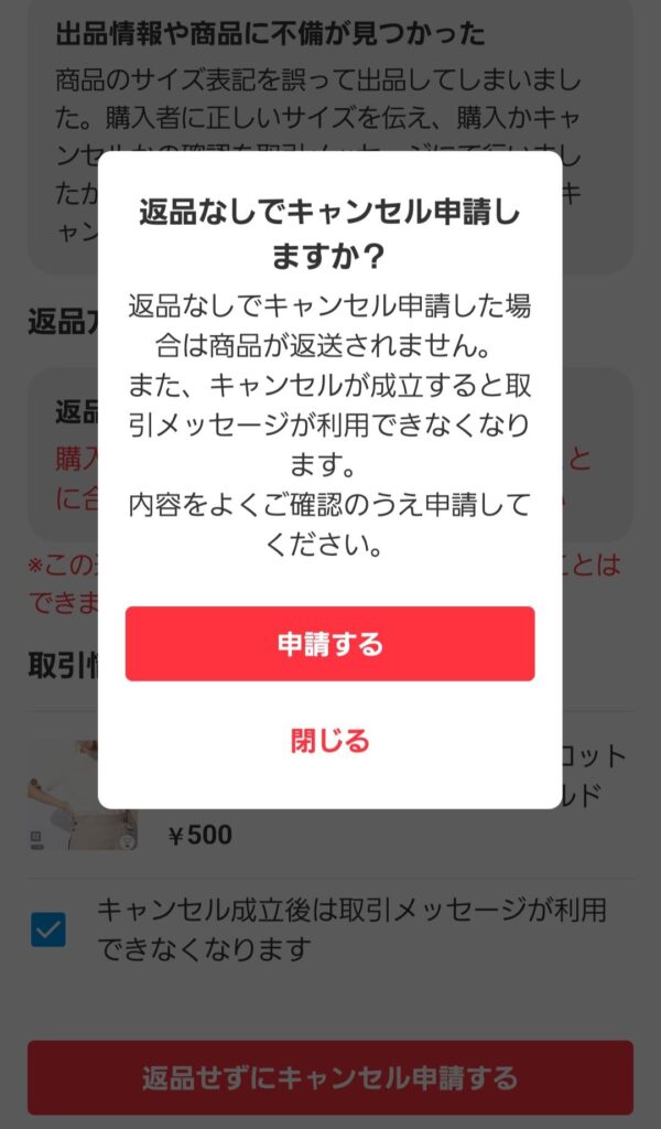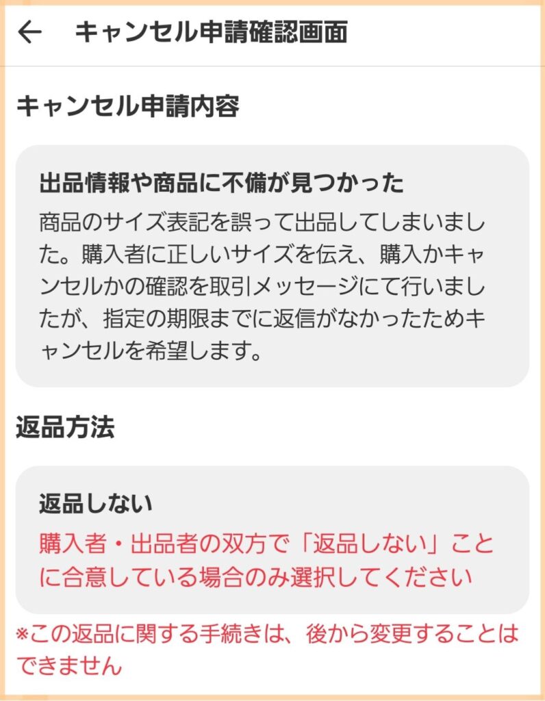 - キャンセル理由の詳細: サイズの誤りを伝え、キャンセル希望の返答があった、もしくはメッセージを待ったが返答がなかった旨を明記。
