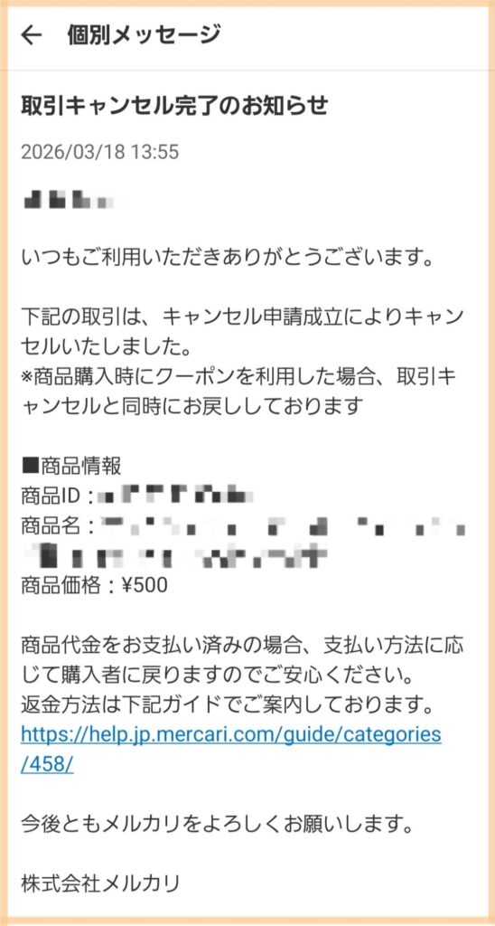 その後はメルカリ事務局でキャンセルと返金の処理がされ、「取引キャンセル完了のお知らせ」が届きます。