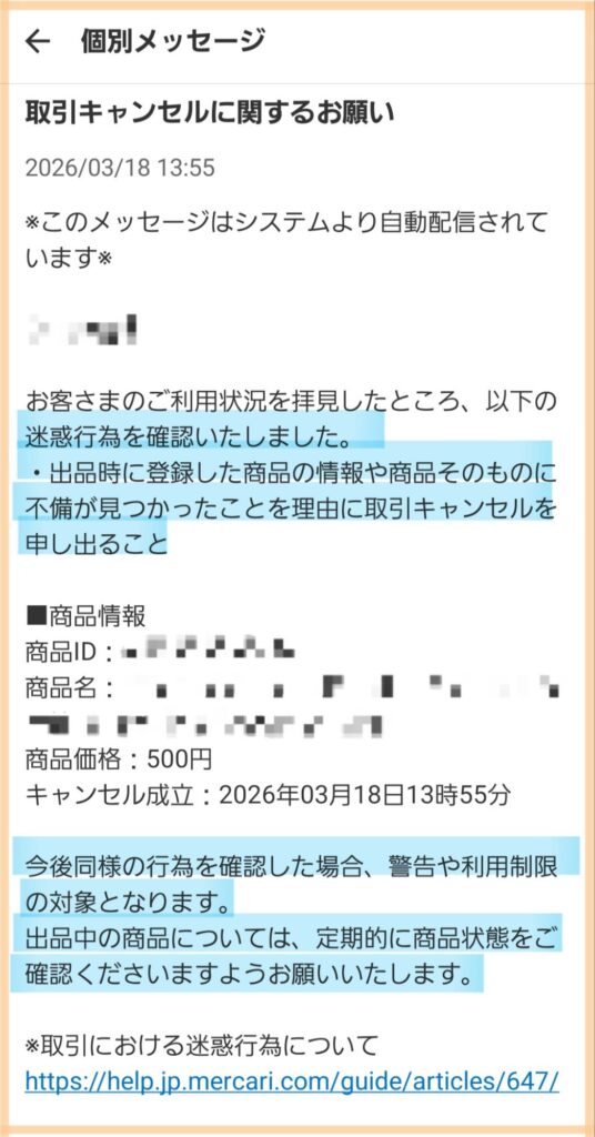 今回私は取引キャンセルのペナルティは特にありませんでしたが、キャンセル完了時には「取引キャンセルに関するお願い」にて注意の内容が届きました。